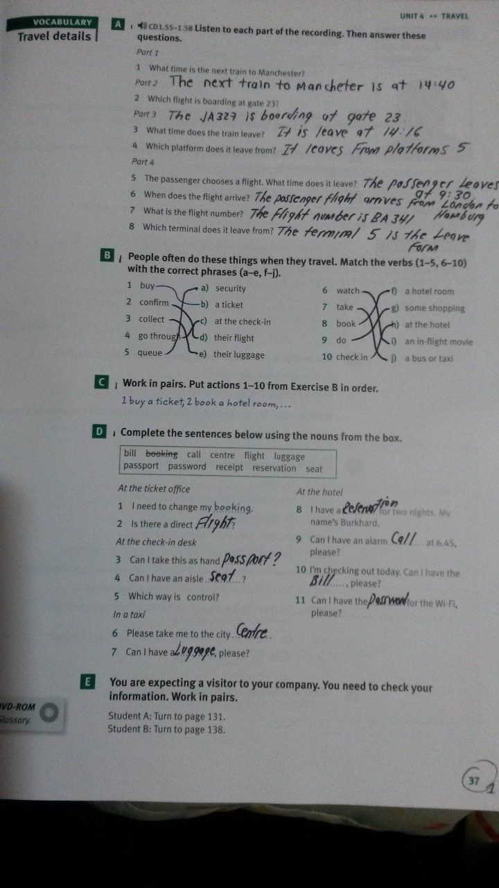 · 1.1.2 Open your Market Leader book on page 37 and develop exercises A to D on travel details (use tracks 1.55-1.58 in your CD to develop these exercises).